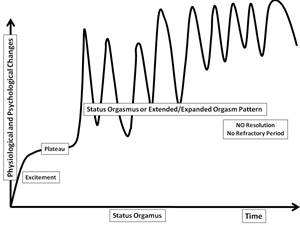 • Without a refractory period, a new orgasmic state commences after each orgasm, without passing to a resolution phase, while orgasmic consciousness state is maintained for a long time (e.g. from a couple of minutes to tens of minutes or hours)