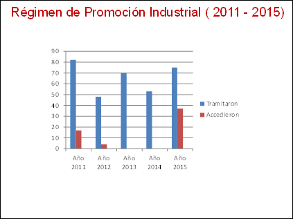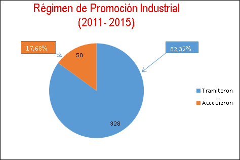 Los resultados obtenidos, realizado el relevamiento de campo, demuestran el bajo nivel de impacto de este instrumento de promoción. Con relación a la cantidad de industrias que iniciaron el trámite para acogerse al régimen, el resultado es que, en los cinco años, un total de 328 industrias, (Gráfico N° 2), lo hicieron (82 en el 2011, 48 en el 2012, 70 en el 2013, 53 en el 2014 y 75 en el 2015).